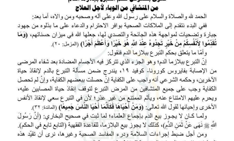 الرئيسية/المحلية/بالوثيقة.. المجمع الفقهي العراقي يجيز التبرع ببلازما النقاهة ويحرم الامتناع المحلية بالوثيقة.. المجمع الفقهي العراقي يجيز التبرع ببلازما النقاهة ويحرم الامتناع Manager Awla2020-06-06 أقل من دقيقة فيسبوك X واتساب تيلقرام مشاركة عبر البريد Manager Awla2020-06-06 أقل من دقيقة فيسبوك X واتساب تيلقرام مشاركة عبر البريد