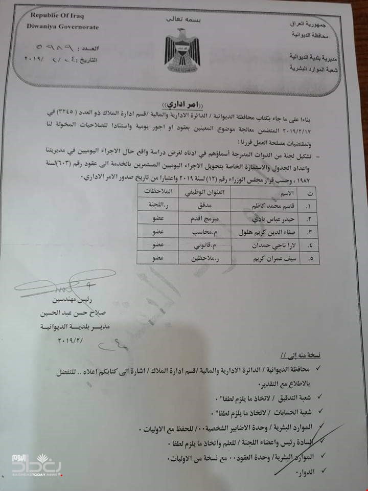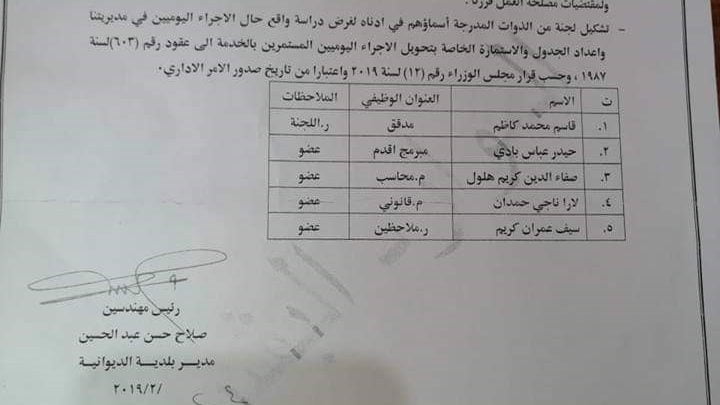 بالوثيقة : بلدية الديوانية تشكل لجنة لتحويل الإجراء إلى عقود