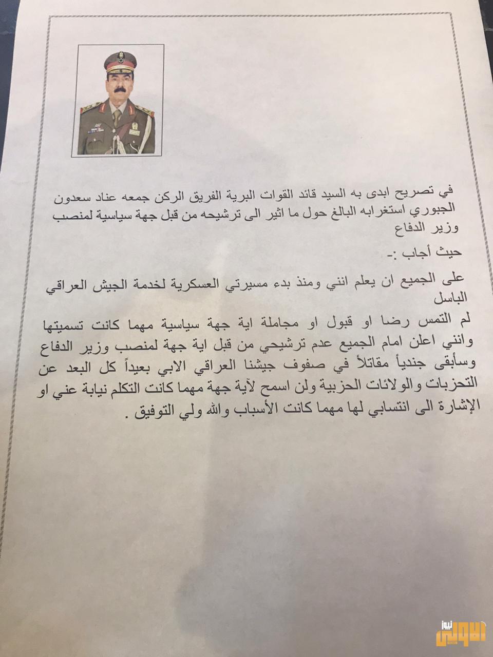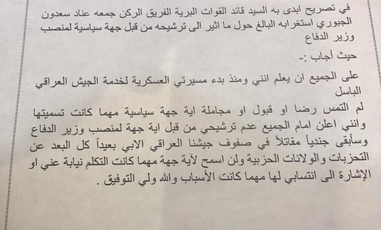 الرئيسية/السياسية/بالوثيقة .. جمعة عناد يستغرب ترشيحه لمنصب وزير الدفاع السياسية بالوثيقة .. جمعة عناد يستغرب ترشيحه لمنصب وزير الدفاع Manager Awla2020-04-22 أقل من دقيقة فيسبوك X واتساب تيلقرام مشاركة عبر البريد Manager Awla2020-04-22 أقل من دقيقة فيسبوك X واتساب تيلقرام مشاركة عبر البريد