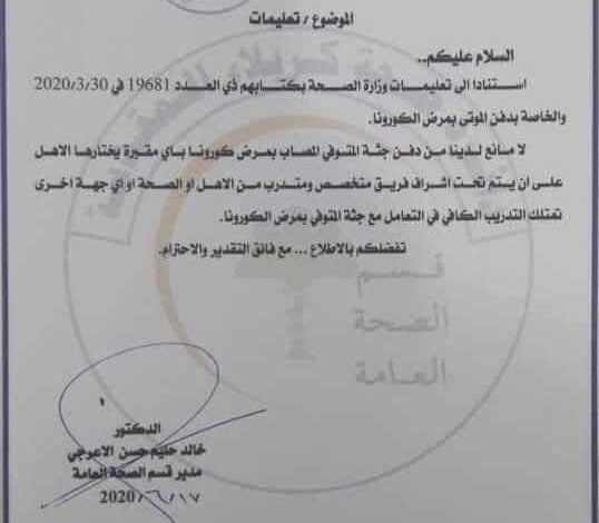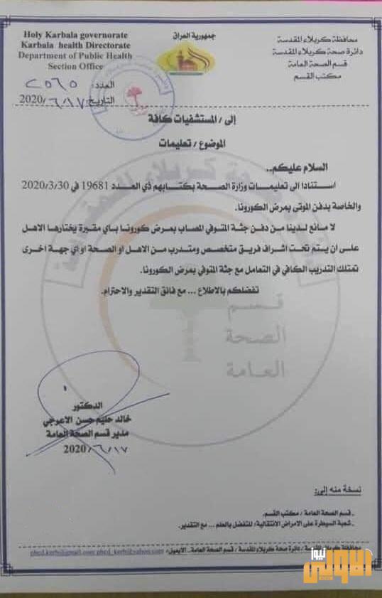 الرئيسية/المحلية/بالوثيقة.. صحة كربلاء تسمح بدفن المتوفين بفايروس كورونا في أية مقبرة يختارها أهل المتوفي المحلية بالوثيقة.. صحة كربلاء تسمح بدفن المتوفين بفايروس كورونا في أية مقبرة يختارها أهل المتوفي Manager Awla2020-06-25 أقل من دقيقة فيسبوك X واتساب تيلقرام مشاركة عبر البريد Manager Awla2020-06-25 أقل من دقيقة فيسبوك X واتساب تيلقرام مشاركة عبر البريد