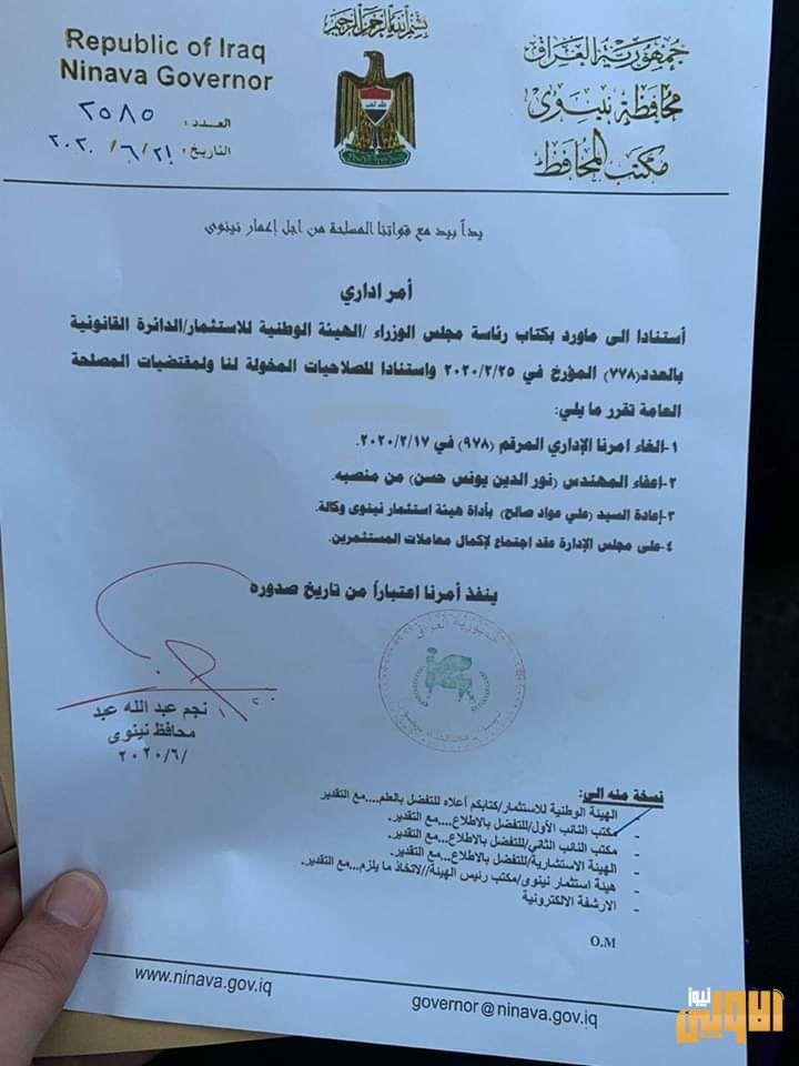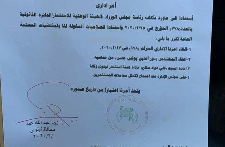 الرئيسية/المحلية/بالوثيقة.. محافظ نينوى يعفي رئيس هيئة الاستثمار في المحافظة المحلية بالوثيقة.. محافظ نينوى يعفي رئيس هيئة الاستثمار في المحافظة Manager Awla2020-06-22 أقل من دقيقة فيسبوك X واتساب تيلقرام مشاركة عبر البريد Manager Awla2020-06-22 أقل من دقيقة فيسبوك X واتساب تيلقرام مشاركة عبر البريد