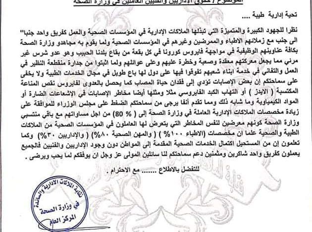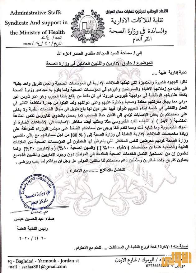 بالوثيقة.. نقابة الملاكات الإدارية بوزارة الصحة تناشد السيد الصدر لمساندتها في نيل حقوقها