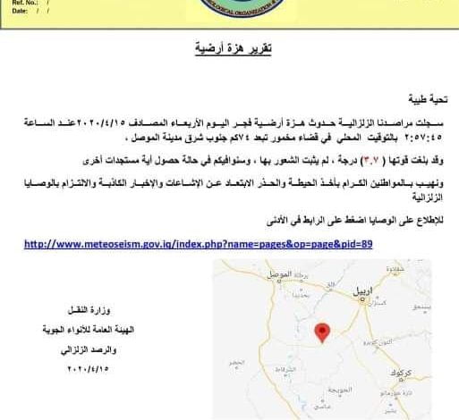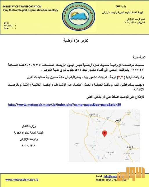 اعلنت وزارة النقل العراقية ، الاربعاء ، ان مراصد الهيئة العامة للانواء الجوية والرصد الزلزالي سجلت حدوث هزة ارضية فجر اليوم الموافق 15/4/2020 في تمام الساعة (2:57:45) بالتوقيت المحلي وقد بلغت قوتها ( 3،7 ) درجة على مقياس رختر .