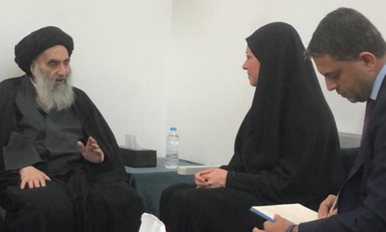 وقالت بلاسخارت، في مؤتمر صحفي عقدته في النجف الاشرف، بعد لقائها المرجع الاعلى، إن “المرجع السيستاني يمثل أهمية كبيرة للامم المتحدة”،
