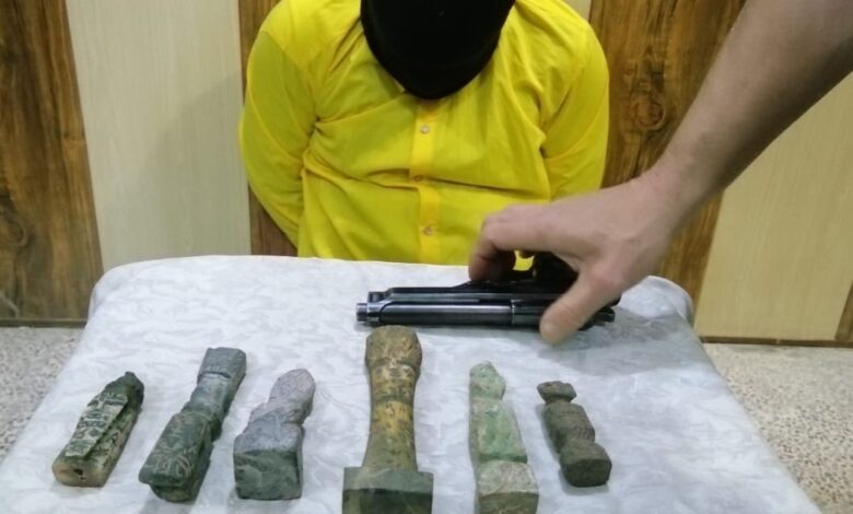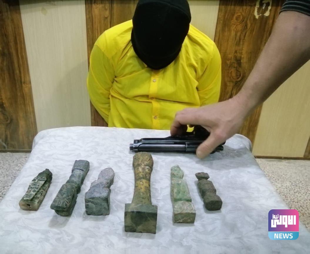 وأضاف البيان، “تم إلقاء القبض على المتهم بالجرم المشهود وكان بحوزته (6) قطع أثرية على شكل تماثيل مرسوم عليها نقوش مسمارية”، لافتا الى ضبط سلاح ناري (مسدس)، كان بحوزته أيضا”.