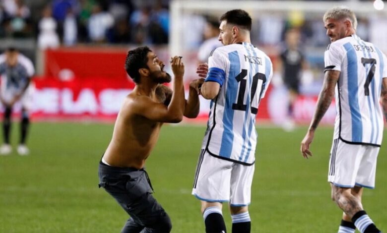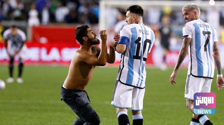 اقتحم أحد المشجعين مباراة الأرجنتين وجامايكا الودية في نيوجيرسي بالولايات المتحدة الأمريكية من أجل الحصول على توقيع النجم ليونيل ميسي على ظهره العاري.