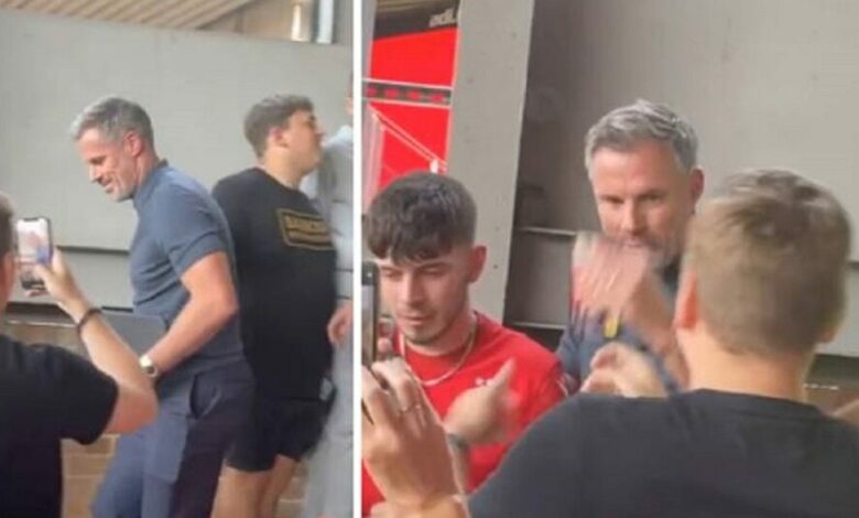 خلال مروره بين المشجعين.. جيمي كاراغر “يخطف” هاتف مشجع أزعجه (فيديو)