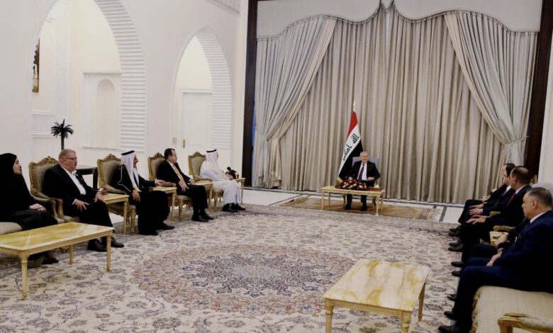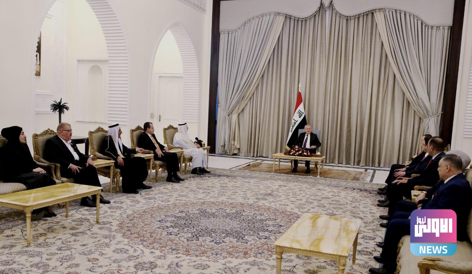 وذكر بيان لرئاسة الجمهورية تلقته (الاولى نيوز)، أن “رئيس الجمهورية عبد اللطيف جمال رشيد، استقبل في قصر السلام ببغداد، وفد تحالف السيادة.