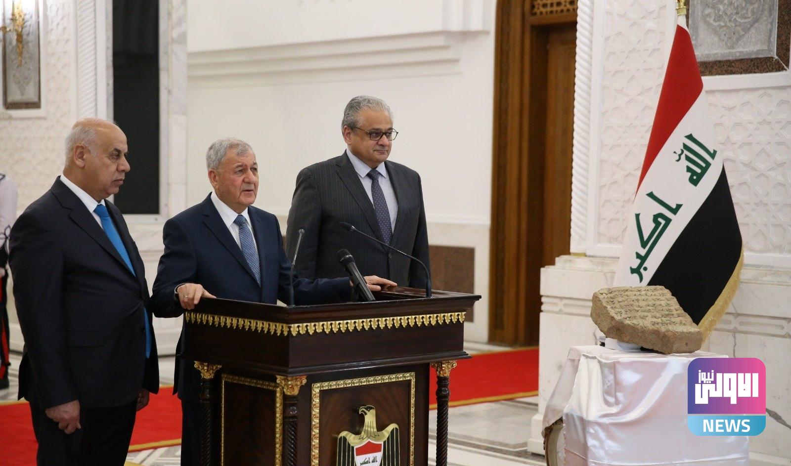 من جانبه وزير الثقافة والسياحة والآثار عن “شكره لرئيس الجمهورية على اهتمامه المستمر بإستعادة آثار العراق”.