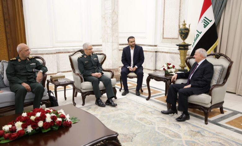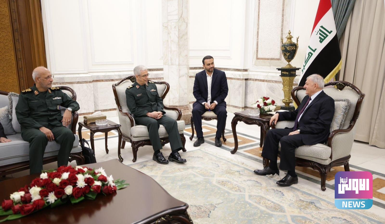 وأضاف أن “اللواء باقري نقل في مُستهل اللقاء تحيات المرشد الأعلى علي خامنئي والرئيس الإيراني إبراهيم رئيسي إلى رئيس الجمهورية وتمنياتهما للشعب العراقي بدوام الأمن والأمان والازدهار، فيما حمّل رئيس الجمهورية رئيس الأركان العامة تحياته إلى المرشد الأعلى وتمنياته له بموفور الصحة وللرئيس والقيادة الإيرانية دوام التوفيق والنجاح”.
