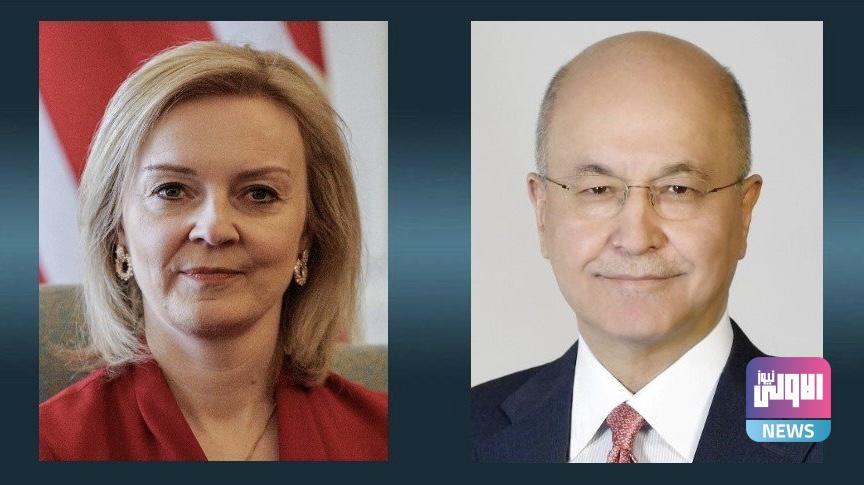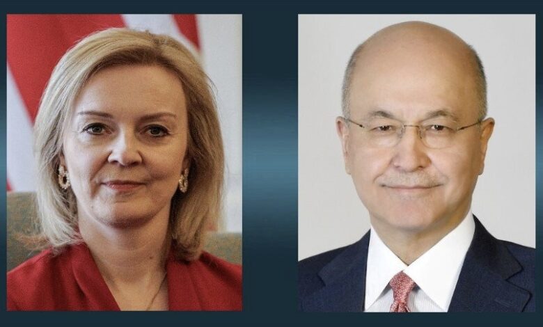 هنأ رئيس الجمهورية برهم صالح، اليوم الأربعاء، رئيسة الوزراء البريطانية الجديدة ليز تراس بمناسبة توليها مهام منصبها، فيما أكد سعي العراق لتعزيز آفاق التعاون المشترك مع بريطانيا.