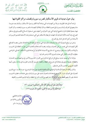 ردا على تهديد سوريا .. الخالصي : أي تصعيد سيدفع الأمة على مواجهة قوى العدوان ومخططاته