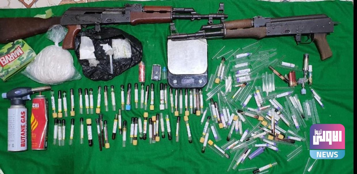 وأكد البيان “ضبط كيس كبير الحجم بداخله مادة الكرستال المخدرة تقدر بحوالي 650 غراما كانت بحوزتهم، اضافة الى ضبط ادوات تستخدم لتعاطي المخدرات يبلغ عددها 194 مع انبوبة وميزان الكتروني يستخدم لوزن المواد المخدرة عند البيع، فضلا عن بندقتي كلاشنكوف ومسدس واحد ودراجة نارية واحدة”.