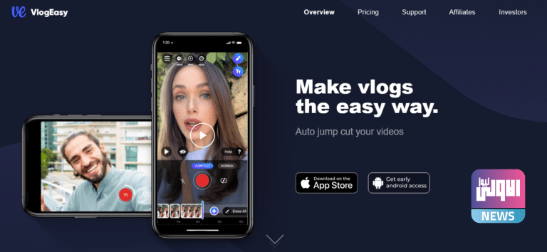 • يعتمد تطبيق (VlogEasy) في عمله على تقنيات الذكاء الاصطناعي ليقوم بتحرير الفيديو نيابة عنك، حيث يمكنك استيراد مقاطع الفيديو من أي مكان واستخدم ميزة (Jump cut) لإنشاء فيديو معدل بشكل مثالي في ثوانٍ.