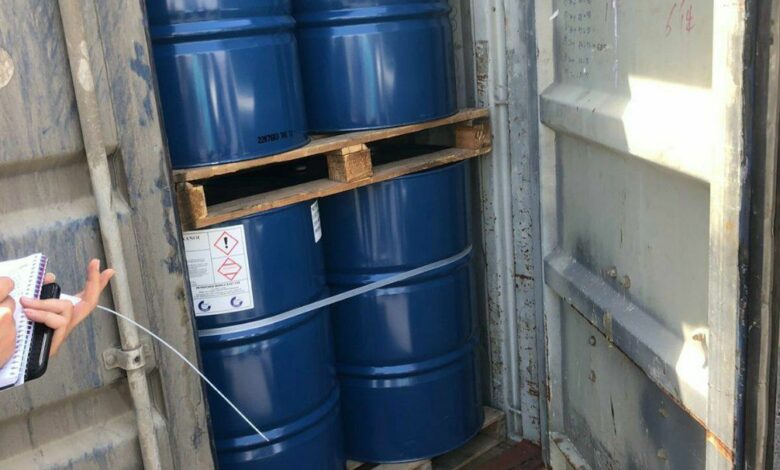 واضاف أنه “وبعد الكشف تبين وجود (6) حاويات تحتوي على (مواد كيماوية خطرة )٬ حاوية عدد(2) تحتوي على (أجزاء معمل لإنتاج أعلاف الدواجن) ٬ حاوية عدد (1) تحتوي على (مواد متنوعة)٬ حاوية عدد(1) تحتوي على (مقاطع ألمنيوم) ٬وجميع المواد التي ضبطت تجاوزت المدة القانونية على بقائها في الميناء دون مراجعة أصحاب العلاقة”، مشيرا الى أنه “تم تشكيل لجنة وتنظيم محضر ضبط أصولي وإحالة المواد إلى القضاء”.