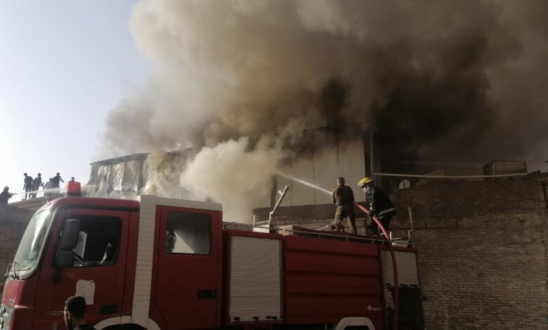 فرق الدفاع المدني تكافح حريقا اندلع داخل مجمع للأدوات الاحتياطية في النجف الأشرف