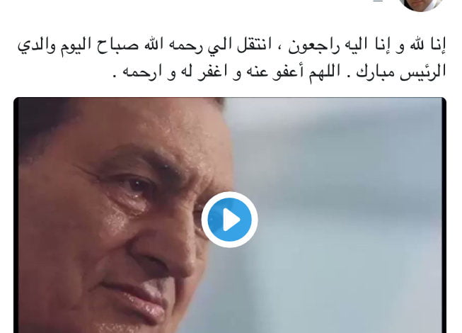 وقال مبارك في تدوينة عبر حسابه في موقع “تويتر”: “إنا لله وإنا إليه راجعون، انتقل إلى رحمة الله صباح اليوم والدي الرئيس مبارك. اللهم أعفو عنه وأغفر له و أرحمه”.