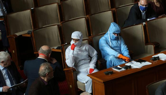 حضر فيسيلين ماريشكي، زعيم حزب بلغاري، ومعه نائبه جلسة في البرلمان وهما يرتديان بدلتين واقيتين من الفيروسات.