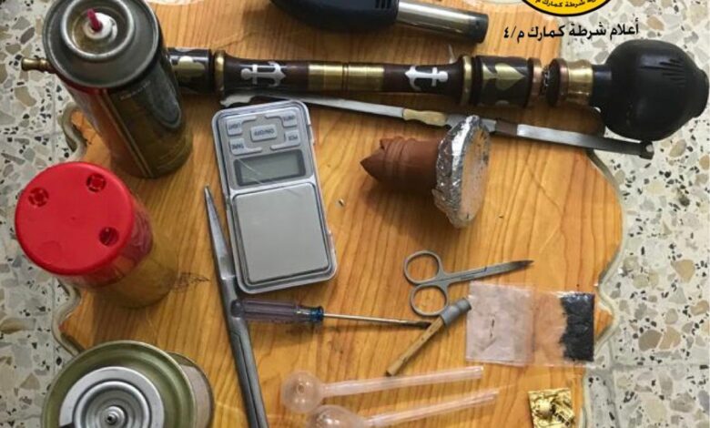تمكنت مفارز شعبة مكافحة المخدرات التابعة لمديرية شرطة كمارك المنطقة الرابعة من إلقاء القبض على متهمين اثنين بحوزتهما مواد مخدرة، وأدوات تعاطي .