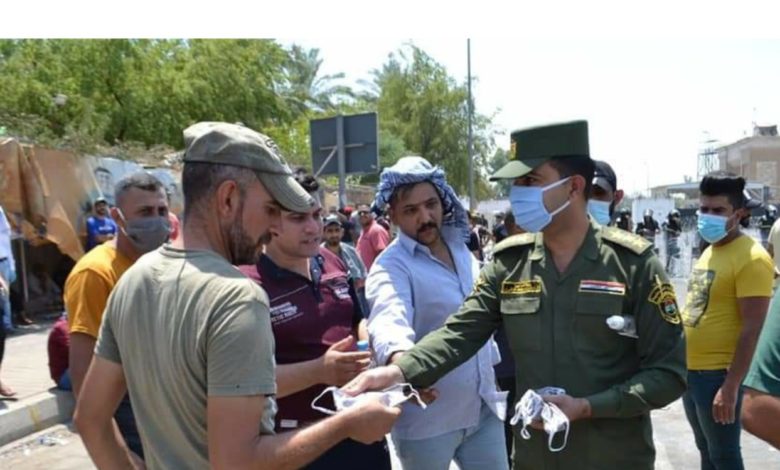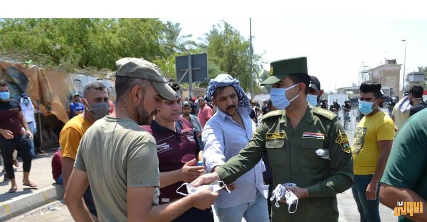 كما قامت قوات القيادة باجراء عدد من الحملات للتعقيم والتعفير في منطقة التظاهر، فضلا عن توزيع الكمامات الطبية والماء البارد على المتظاهرين.