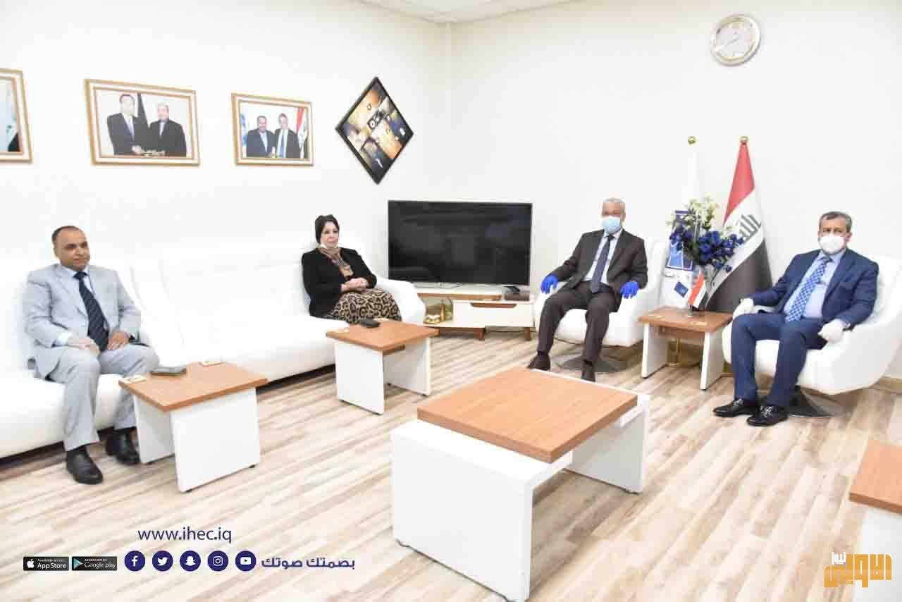 رئيس مجلس المفوضين يستقبل نائب رئيس مجلس النواب العراقي جليل عدنان خلف نائب رئيس مجلس النواب العراقي بشير حداد بحضور رئيس الادارة الانتخابية احلام الجابري واعضاء مجلس المفوضين فتاح محمد حسين عباس فرحان حسن في مقر المفوضية يوم الثلاثاء الموافق 21/4/2020 .