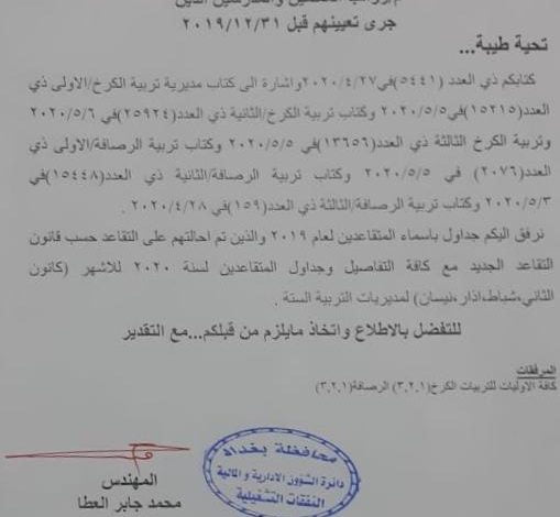 واشار اعلام المحافظة الى ان هذا الإجراء يأتي بناء على “توجيهات المحافظ المهندس محمدجابرالعطا، وبناء على كتاب وزارة المالية، حيث رفعت المحافظة جداول بجميع اسماء المحالين للتقاعد لسنة ٢٠١٩ وحسب قانون التقاعد الجديد مع جميع التفاصيل بالإضافة الى جداول باسماء المتقاعدين لسنة ٢٠٢٠ للأشهر (كانون الثاني وشباط واذار ونيسان)، لمديريات تربية بغداد الست ( الكرخ الاولى والثانية والثالثة، والرصافة الاولى والثانية والثالثة) الى وزارة المالية دائرة المحاسبة / النقدية” موضحا ان “هذه الخطوة تأتي للاسراع باطلاق رواتب المتعينيين الجدد في مديريات تربية بغداد لجانبي الكرخ والرصافة”.