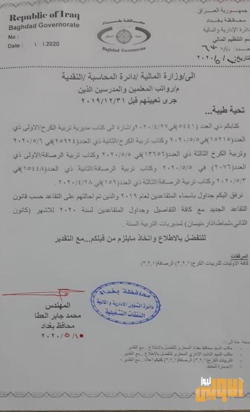 محافظة بغداد تعلن رفع اسماء المتقاعدين الى المالية لغرض اطلاق رواتب المتعينين الجدد في مديريات التربية