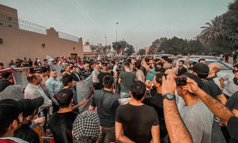 تجمع عشرات المحتجين أمام القنصلية التركية في منطقة الوزيرية وسط بغداد، الخميس(21 تموز 2022).