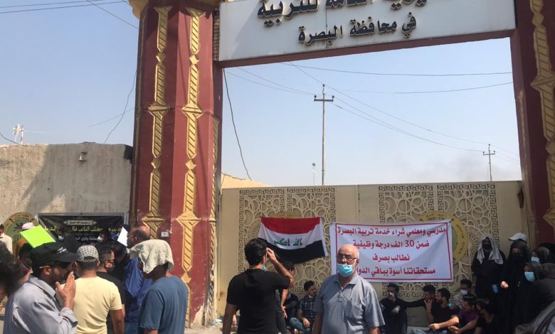 أغلق محتجون، الأحد، بوابة تربية محافظة البصرة لعدم تلبية مطالبهم المتعلقة بتحويلهم إلى عقود وكذلك عدم صرف مستحقاتهم المالية لأكثر من 9 اشهر.