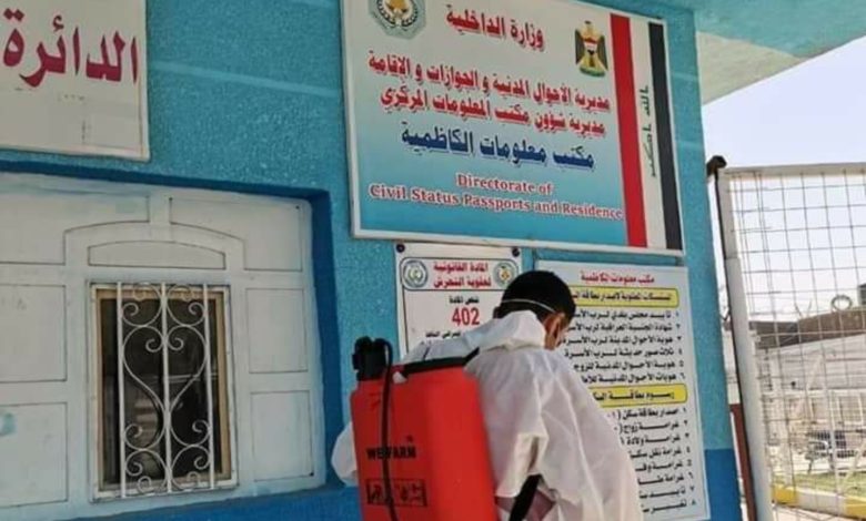 قامت مديريات الأحوال المدنية والجوازات والإقامة في محافظات بغداد، وذي قار، ونينوى بحملات تعفير وتعقيم، شملت المديريات والأقسام التابعة لها، للحد من تفشي فايروس كورونا، والتأكيد على ضرورة الالتزام بتعليمات وزارة الصحة، وخلية الأزمة، ومنع التجمعات، والاختلاط، والتزاور داخل الدائرة، كما شملت حملة تفتيش للمديريات والأقسام والشعب الاطلاع على مجريات العمل، والتأكيد على بذل المزيد من الجهود لخدمة الصالح العام، وضرورة الالتزام بالتعليمات وارتداء الكمامات والقفازات وتعفير الدوائر باستمرار للحد من تفشي الفايروس.