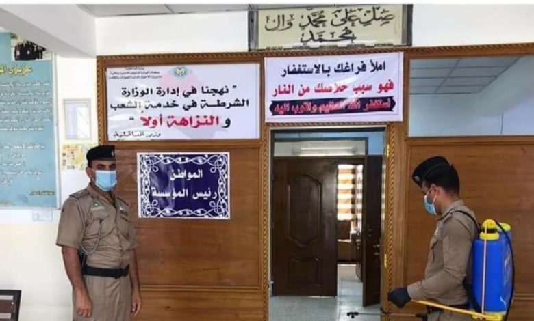 بناء على توجيهات معالي وزير الداخلية السيد عثمان الغانمي، وبتأكيد مدير عام الأحوال المدنية والجوازات والإقامة اللواء رياض جندي الكعبي على مدراء مديريات المحافظات على متابعة سير العمل، واتخاذ الإجراءات الوقائية، أشرف العميد جاسم عبد حسين مدير الأحوال المدنية والجوازات والإقامة لمحافظة ديالى على حملة تعقيم وتعفير قسم مكاتب معلومات ديالى، وقسم شؤون الأحوال، ودوائر البطاقة الوطنية في بعقوبة، الوجيهية، اشنونا، بني سعد، السدالعظيم للوقاية من الإصابة بفايروس كورونا والحفاظ على سلامة الجميع.