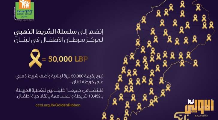 نذكر أنه من خلال تغطية الخريطة اللبنانية بشرائط ذهبية، باعتبار الشريط الذهبي هو شعار عالمي للدعم والتوعية عن مرض سرطان الأطفال، نكون قد أمّنا العلاج لسبعة أطفال، وهو ما سيحققه المتبرعون ليعبروا عن تضامنهم أجمعين لنفس الهدف، مقيمين ومغتربين، لدعم الأبطال الصغار الذين يصارعون مرض السرطان من خلال دعم المركز الذي يعالج هؤلاء الأطفال من دون أي بدل ومن دون اي تفرقة.
