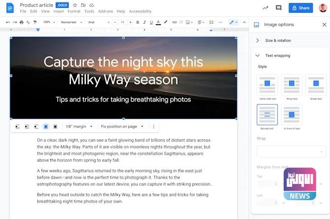أضافت خدمة مستندات جوجل ميزة جديدة تتيح للمستخدمين إضافة النصوص على الصور في الملفات، لتعيد بذلك الأذهان لما توفره مايكروسوفت منذ ما يزيد عن عقدين من الزمن على برنامج وورد.