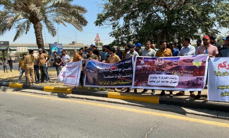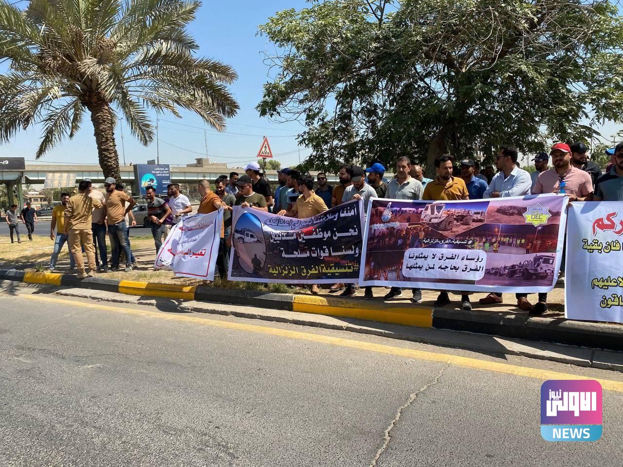 مظاهرات لمنتسبوا الفرق الزلزالية امام مبنى وزارة النفط بالعاصمة بغداد للمطالبة بأجواء عمل امنة (صور)