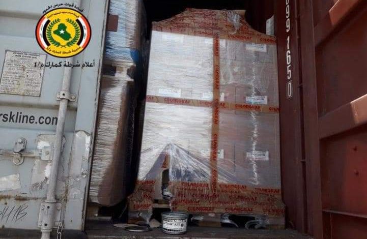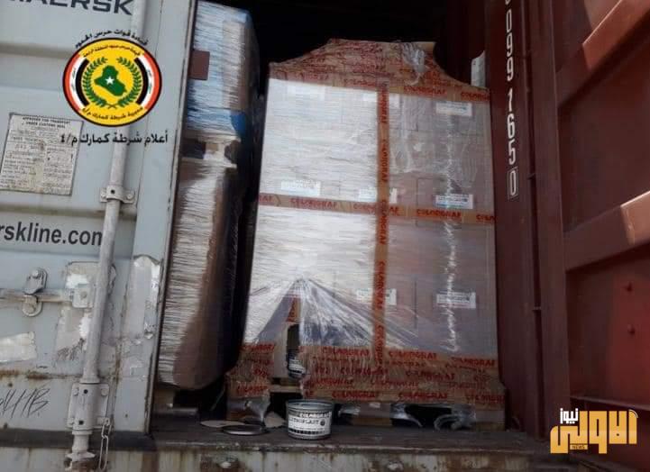 تمكنت مفارز مركز شرطة كمرك ام قصر التابعة لمديرية شرطة كمارك المنطقة الرابعة من ضبط حاوية تحتوي على (احبار طباعة) معبأة في علب بلاستيك،