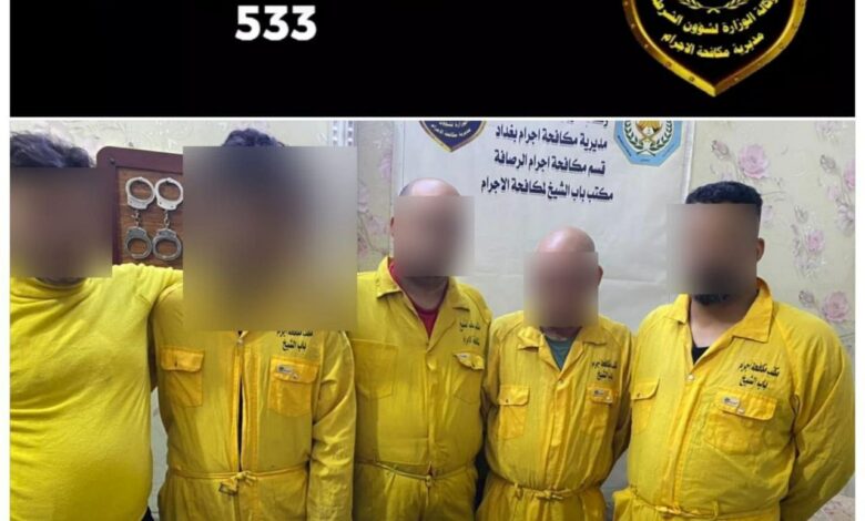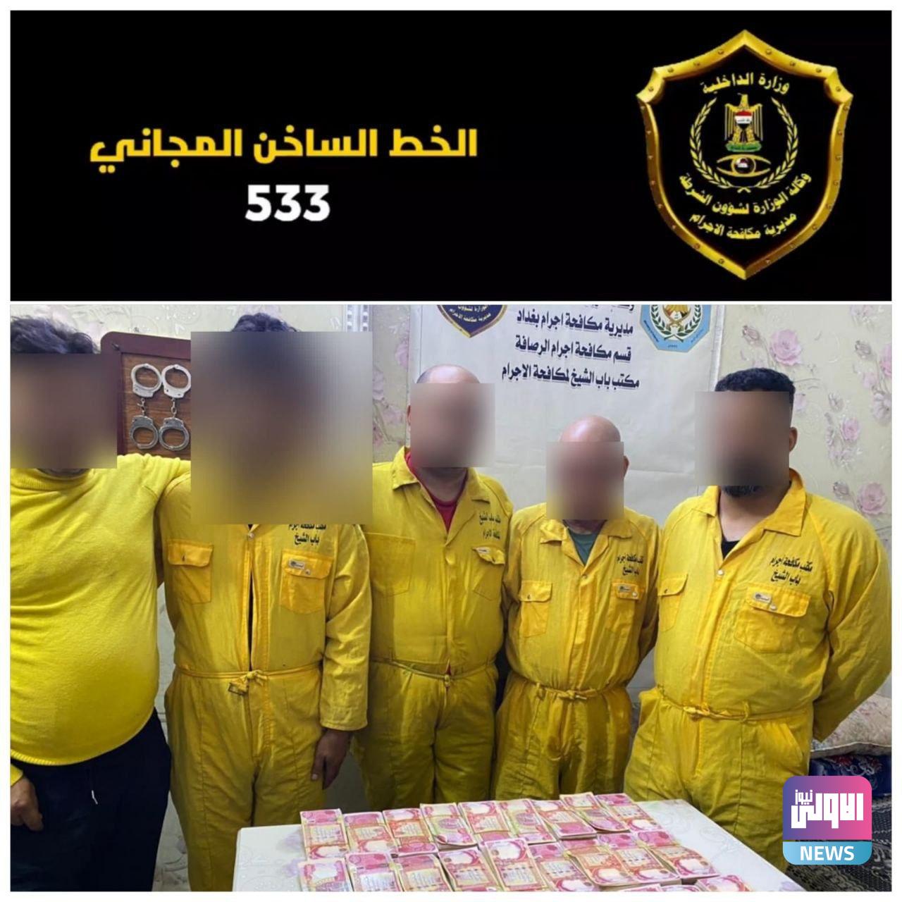 تمكنت مفارز مديرية مكافحة اجرام بغداد/ مكتب مكافحة اجرام باب الشيخ من القاء القبض على عصابة تسليب مكونة من خمسة متهمين قاموا بإيقاف عجلة امرأة وسرقوا منها (131 مليون دينار) تحت تهديد السلاح في منطقة شارع فلسطين ببغداد.