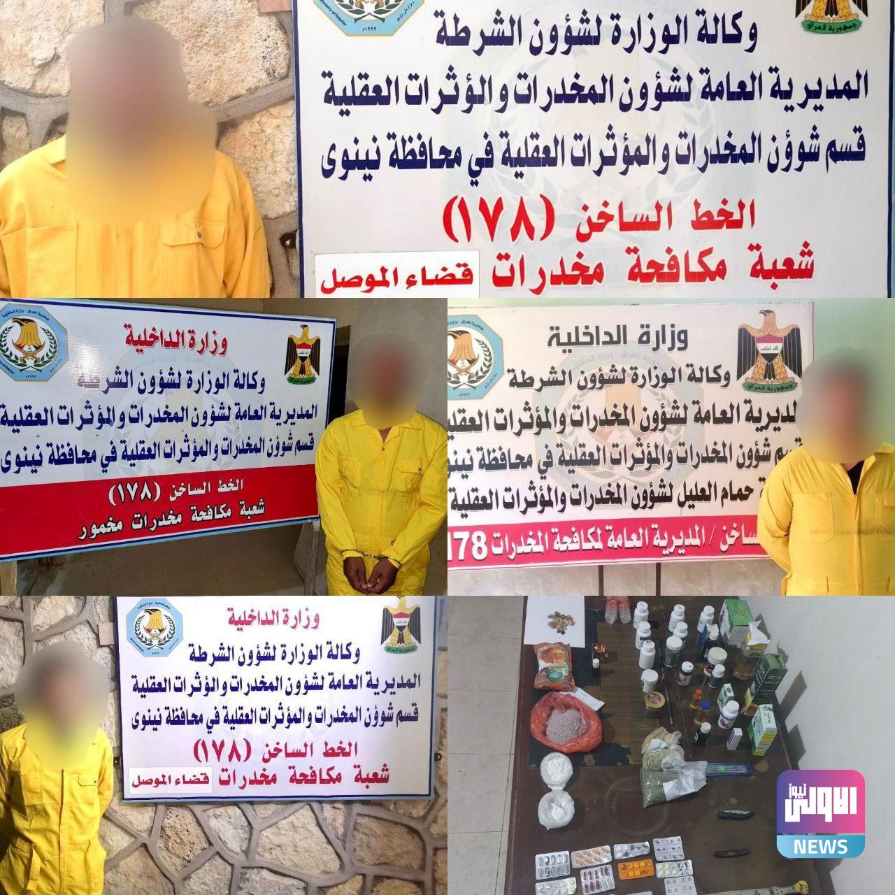 تمكنت المديرية العامة لمكافحة المخدرات والمؤثرات العقلية في نينوى من إلقاء القبض على أربعة متهمين يقومون ببيع وترويج وتعاطي المواد المخدرة وحبوب المؤثرات العقلية صادر بحقهم أوامر قبض من القضاء، ضبط بدار أحد المتهمين على أدوية وحبوب مؤثرات عقلية مختلفة الأنواع، تم اتخاذ الإجراءات القانونية بحقهم وتوقيفهم وفق المادة ٢٨ من قانون المخدرات والقرار ٣٩ لسنة ١٩٩٤ .