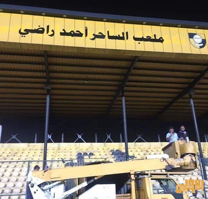 وقال رئيس الهيئة الأدارية لنادي الكرخ شرار حيدر إن”أعمال استبال اسم الملعب الى الساحر احمد راضي بدأت اليوم الخميس برفع الاسم القديم قبل االمباشرة بوضع الاسم الجديد له تخليداً وتكريماً للاعب الدولي احمد راضي الذي قدم بنفس الملعب عروضه التي مازالت عالقة في الذاكرة يوم كان لاعباً للرشيد”.