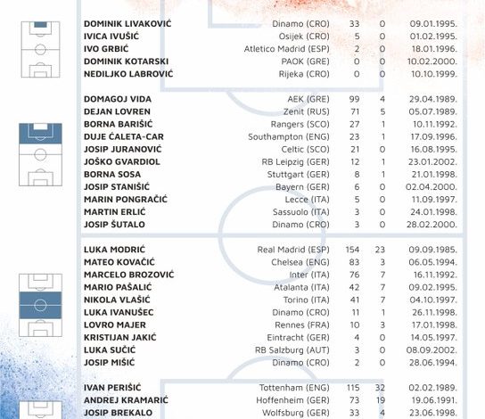 ومن بين الأسماء في قائمة منتخب الكرواتي، إيفان بيريسيتش لاعب توتنهام، ووسط ملعب تشيلسي ماتيو كوفاسيتش، ونجم المنتخب الأول لوكا مودريتش لاعب ريال مدريد، الذي أعلن عزمه الاعتزال الدولي بعد البطولة.