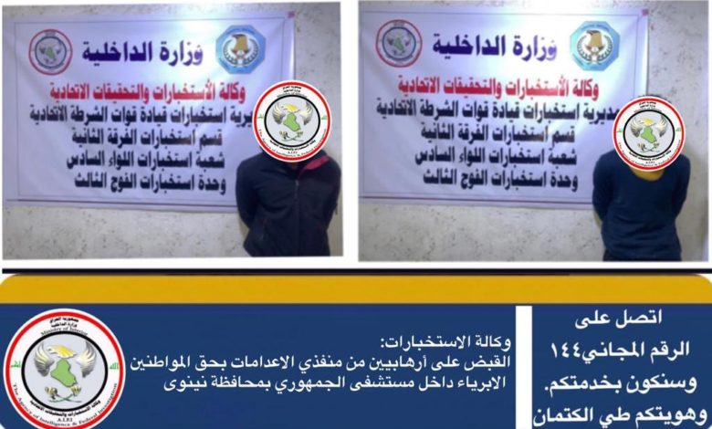 واضاف البيان، ان “العنصرين الارهابيين, كانا يعملان ضمن ما يسمى (مفارز ابو ليث الانصاري) تحت كنى ( ابوحاتم، وابو عناد) المشتركة بتنفيذ عمليات الاعدام التي طالت المواطنين الابرياء داخل مستشفى الجمهورية في محافظة نينوى”.