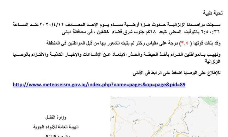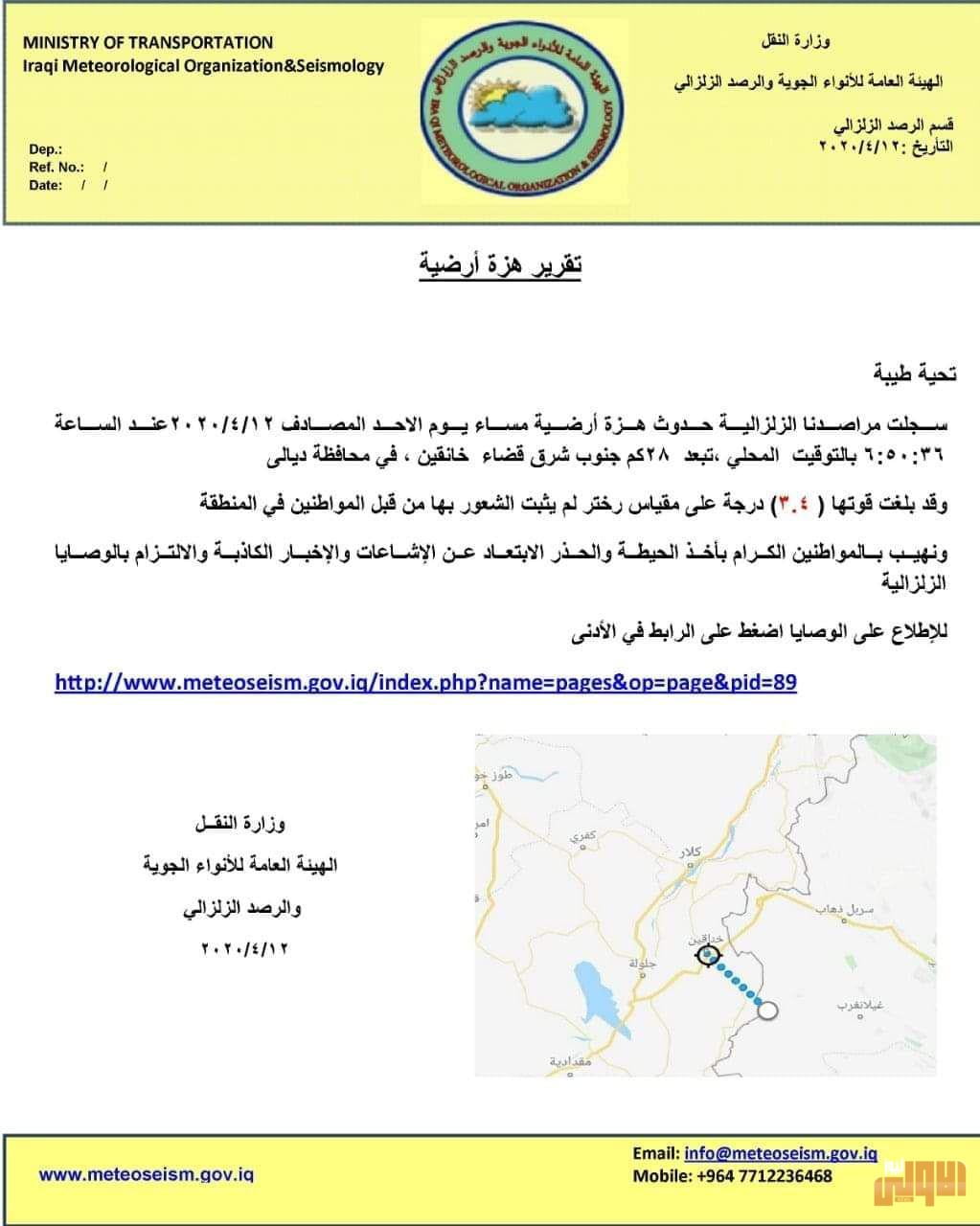 سجلت المراصد الزلزالية لوزارة النقل العراقية حدوث هزة ارضية ،مساء الاحد ، الموافق 12/4/2020 في تمام الساعة (6،50،36) مقياس رختر جنوب شرقي قضاء خانقين ديالى