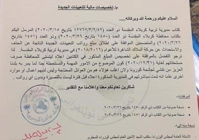 بعد مخاطبة وزارة المالية من قبل النائب حامد الموسوي دائرة الموازنه تبين للذين جرى تعيينهم من المعلمين والمدرسين في وزارة التربية ومديريات التربية في بغداد والمحافظات قبل ٢٠١٩/١٢/٣١ ان يقوموا بتزويد دائره المحاسبه بقوائم صرفياتهم بكتاب رسمي وفق جدول مدقق ومطبوع على الاكسل وموقع من قبل مدير الموارد البشريه و مدير الماليه و مدير التدقيق ومدير عام التربيه والمحافظ على ان يتضمن الجدول ( الاسم الثلاثي الدرجه الوظيفيه ،العنوان الوظيفي ،رقم وتاريخ كتاب دائره الموازنه بالحذف والاحداث ،رقم الامر وتاريخه الصادر بالمباشره ، مقدار الراتب الاسمي ، كافه المخصصات التي يتقاضاها مفصلة، مساهمه التقاعد الحكوميه ) و حسب الجدول ادناه