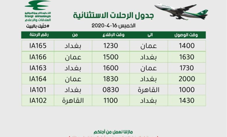 أعلنت وزارة النقل عن جدول رحلات الخطوط الجوية العراقية الأستثنائية ليوم غد الخميس 2020/4/16استناداً لقرارات وموافقة اللجنة العليا للصحة والسلامة الوطنية .