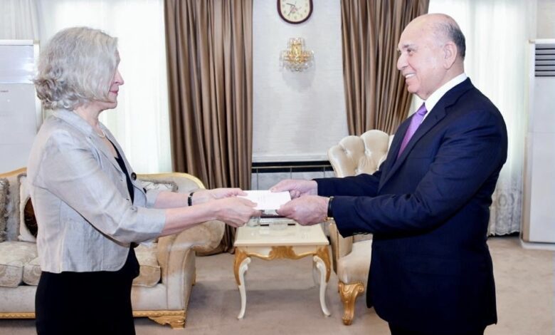 وذكر بيان لوزارة الخارجية تلقته (الاولى نيوز )، أن ” نائب رئيس مجلس الوزراء وزير الخارجيَّة فؤاد حسين، تسلم اليوم الثلاثاء في مبنى وزارة الخارجيَّة ببغداد، نسخ من أوراق اعتماد سبعة سفراء جدد لدى العراق، كل من : سفيرة جمهورية فنلندا آنو ساريلا، وسفير بعثة الإتحاد الأوروبي توماس سيلر، وسفير دولة قطر سلطان مبارك الكبيسي، وسفيرة كندا كاثي بونكا، وسفير الجمهورية التونسية شكري اللطيف، وسفيرة جمهورية ألمانيا الاتحادية كرستيانه هومان، وسفير دولة فلسطين أحمد محمود الرويضي.”