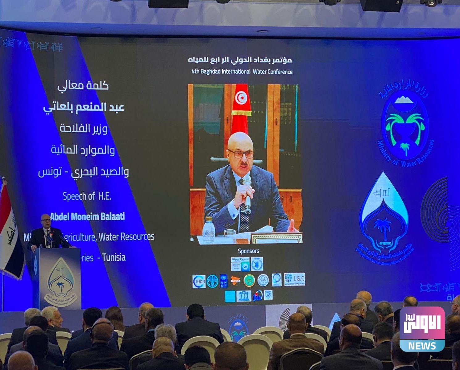وتابع متحدثا عن المؤتمر “يسعدني أن أكون بينكم اليوم بمناسبة فعاليات مؤتمر بغداد الدولي للمياه في دورته الرابعة وهو فرصة لتدارس تحديات التغير المناخي والخروج بحلول، وعن بلادي أقول تعتبر تونس من البلدان التي تعاني من قلة مواردها المائية التقليدية، حيث يقدر نصيب الفرد بحوالي اربعمائة وعشرين مترا مكعبا في السنة، وهذا بطبيعة الحال يعد تحت الخط العالمي وبحلول سنة 2030 ستصل هذه الحاجة الى ثلاثمائة وستين مترا مكعبا لكل مواطن في السنة”.