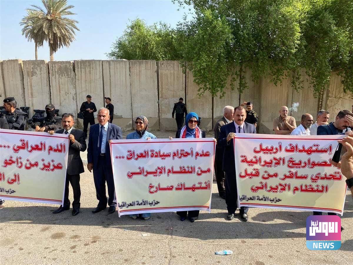 نظم ناشطون وقفة احتجاجية أمام السفارة الايرانية في العاصمة بغداد، استنكارا للهجمات التظاهرة امام السفارة الايرانية ببغداد، استنكارا للهجمات الصاروخية على أربيل.