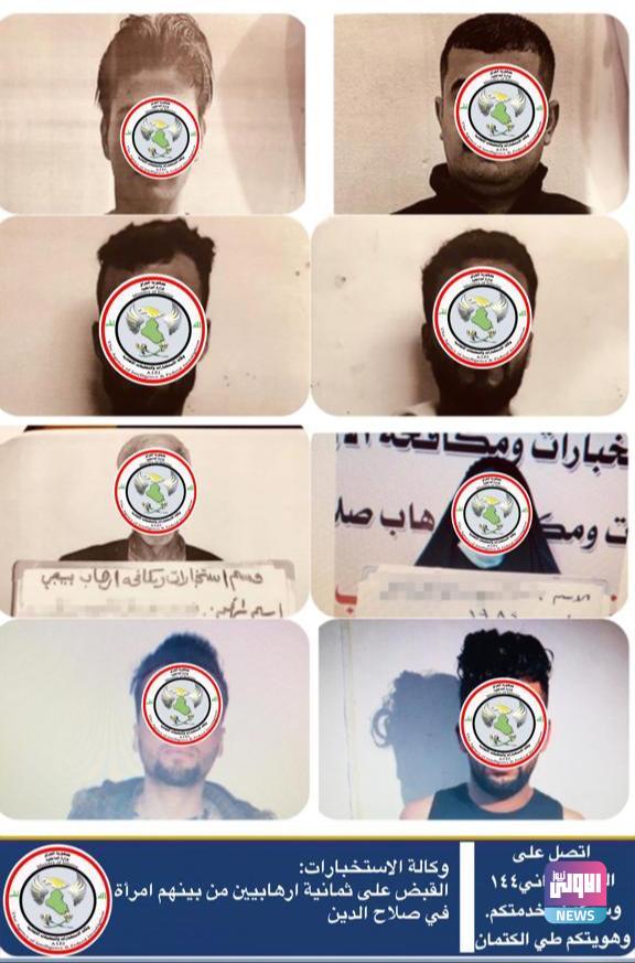 تنفيذا لتوجيهات وزير الداخلية المحترم ومن خلال متابعة عناصر عصابات داعش ، تمكنت مفارز وكالة الاستخبارات المتمثلة بمديرية استخبارات صلاح الدين في وزارة الداخلية من إلقاء القبض على ثمانية ارهابيين من بينهم امرأة بمناطق متفرقة من محافظة صلاح الدين مطلوبين وفق احكام المادة ٤ارهاب لانتمائهم لعصابات داعش الارهابية،