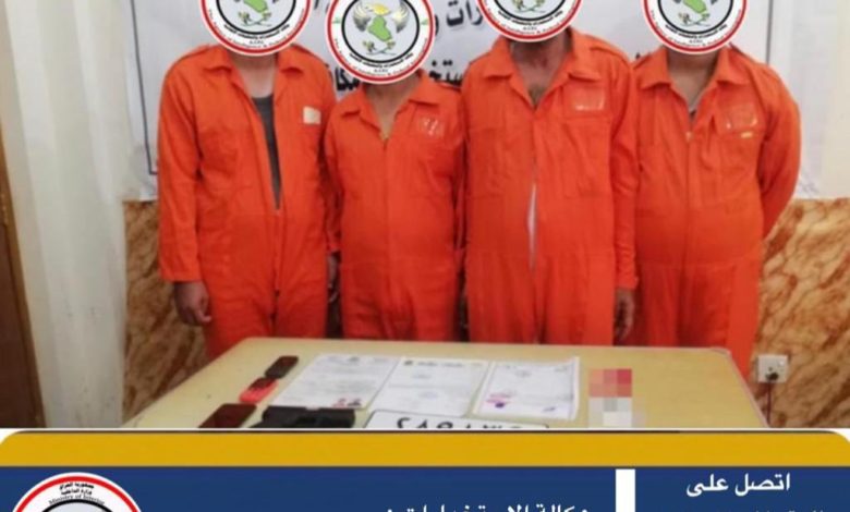 تمكنت مفارز وكالة الاستخبارات المتمثلة بمديرية استخبارات النجف في وزارة الداخلية من القاء القبض على عصابة مكونة من اربعة متهمين في مركز المحافظة يتاجرون ببيع العجلات غير الاصولية التي تدخل الى البلاد بصورة غير قانونية وبالجرم المشهود وبحوزتهم عجلتين و لوحات تسجيل و سنويات مختلفةً جميعها مزورة ، كما ضبطت مبلغ مزيف من المال بحوزه احدهم من فئة خمسة الاف دينار عراقي ومسدس نوع كلوك .