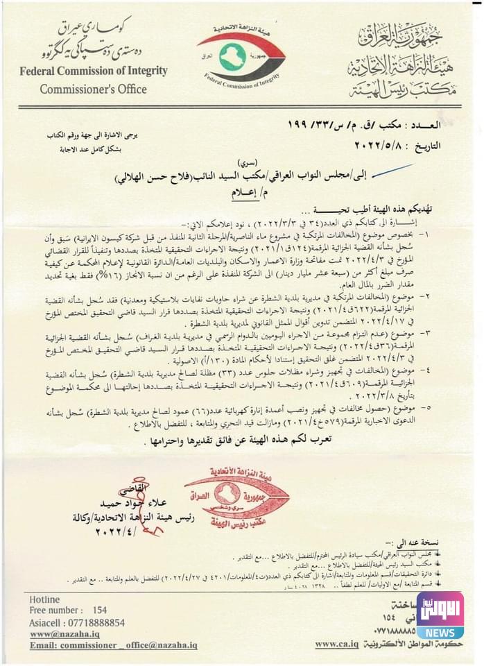 وأفادت الوثيقة، بـ “اجراءات تحري حول موضوع المخالفات في مشروع تجهيز ونصب اعمدة انارة كهربائية لصالح بلدية الشطرة”.