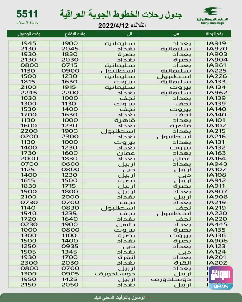 أعلنت الخطوط الجوية العراقية، اليوم الاثنين، عن جدول رحلاتها ليوم غد الثلاثاء.
